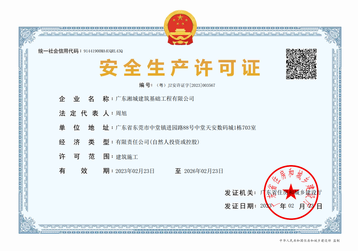 廣東湘城建筑基礎工程有限公司,成立于2016年,注冊資金4888萬元,持有地基基礎工程專業承包壹級資質,具有安全生產許可證。可承接各種基礎類施工,包括各類樁基礎、基坑支護、邊坡支護、地基強夯處理等施工業務。公司為地基與基礎工程專業承包、工程施工、技術咨詢、技術開發、技術服務、信息咨詢實體型企業。